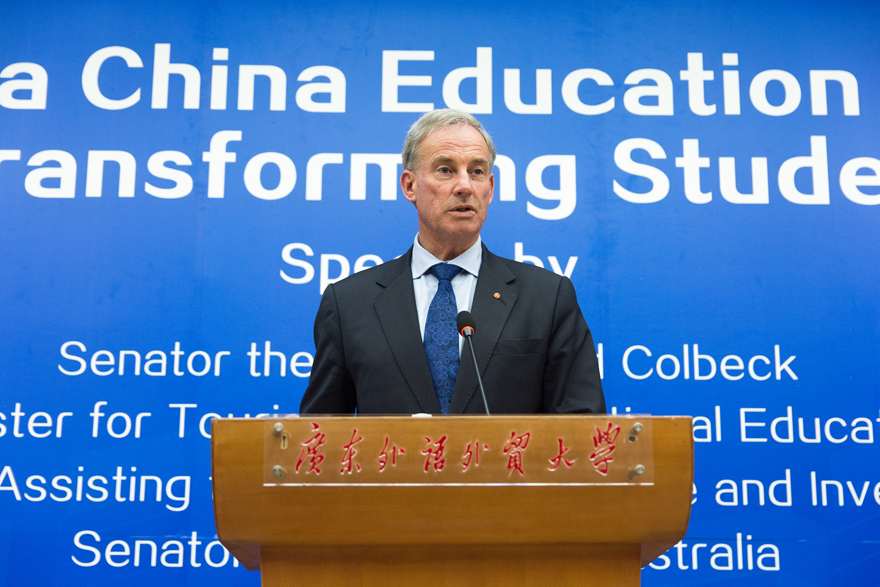 Later, Senator Colbeck delivered an inspiring speech in the Lecture Hall of GDUFS library, entitled “The Australia China Partnership -- Transforming students”. At the beginning, on behalf of all faculties and students, President ZHONG extended a warm welcome to Senator Colbeck, who also serves as Minister for Tourism and International Education and Minister Assisting the Minister for Trade and Investment. According to Senator Colbeck , Australia is ranked the third, after the United States and the United Kingdom, for attracting international students. To maintain and grow the global reputation, the universities and institutions of Australia strive to set a world class example in offering teaching, learning and researching opportunities. Considering the fact that China is the major source of international students in Australia and that China is the most popular destination for Australian students, great value has been placed on the education partnerships between the two countries. He predicted that the bilateral relationship will develop from strength to strength in the areas of trade, investment, education and tourism, as Australia is transitioning from a resources-based economy to one supported by a modern service sector that is fully integrated with global networks.