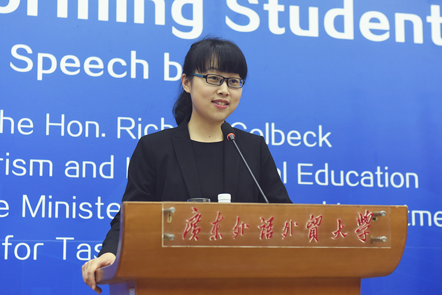 In 2015, over one million Chinese tourists reached the shores of Australia, contributing greatly to Australian tourism income. Likewise, a great number of Australians traveled around China due to their interest in the “most wonderful culture on earth”. The blossom of the tourism industry in turn facilitates the educational exchanges. In the opinion of Senator Colbeck, education is halfway towards the prosperity of the communities. In this sense, receiving education in a multicultural environment would be a life-changing experience beneficial to both individuals and society. Since GDUFS has established cooperative relationships with University of Queensland, Queensland University of technology, Newcastle University, University of Wollongong, Deakin University among others, Senator Colbeck encouraged students to grasp the opportunity once they are qualified to study in Australia. After Senator Colbeck’s speech, Tao Xiaolei, an undergraduate who spent a year at Queensland University as an exchange student, shared her experience in Australia, recalling her memories surrounded by three key words: “diversity”, “potentiality” and “family”, which won laughter and applause among the audience.