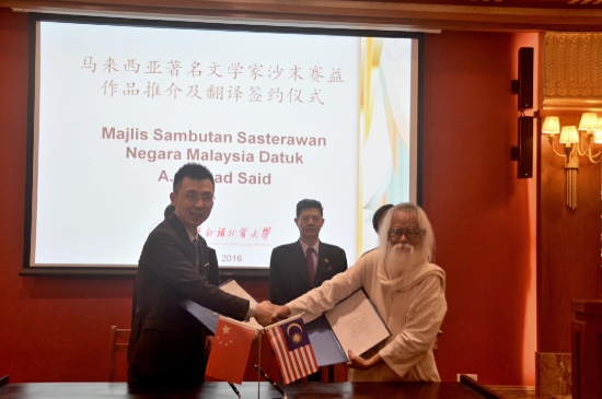 The meeting was then followed by the signing ceremony. A. Samad Sain authorized the translation work of his novel Di Hadapan Pulauto TAN Xiao, the Head of Malay Language Department. According to the introduction given by A. Samad Sain, the novel tells a story thathappenedduringthe period of Japanese invasion ofMalaysia. Besides the cultural exchange, he also believed thatthe translation could provide researchers with information about the war.
