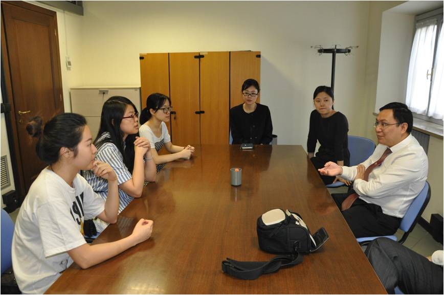 Given that currently, seven Italian learners from GDUFS are studying there, on 6th June, after looking around the archaic library, laboratories and some other equipment of the university, LIU Haichun met with those GDUFS’s exchange students, eager to hear about their study and living situations.