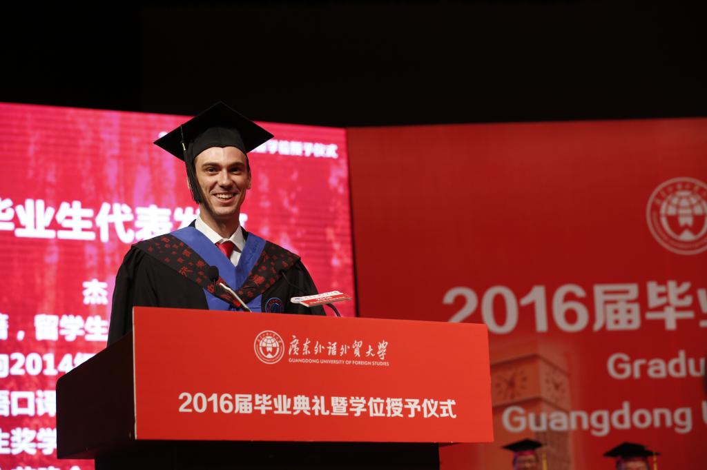 Jeff, an international student representative from Switzerland, shared his experiences and stories at GDUFS, and won rounds of applause with his fluent and native-like Chinese. He not only thanked all the help given by the teachers and students, but also expressed his deep love for GDUFS, and for China. He said, “GDUFS is my home, and I love it.”