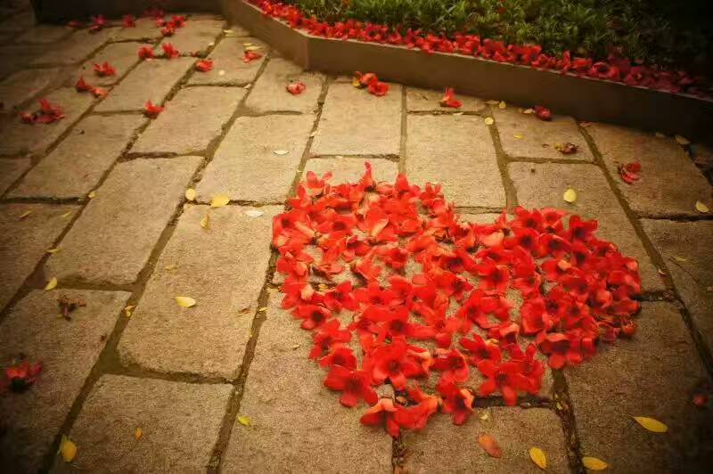 A splash of scarlet appeared in my dream like a huge fire giving off light and heat radiantly. “What is it that is so powerfully fascinating?” I murmured in search of that admiration-provoking vague figure.I walked and walked heading towardsthat towering icon and finally when I reached it, I was surprised at the scene lying before me where kapok flowers dotted the ground dying the ground blood red.With regret and sympathy,I bent down,carefully picked up one flower and gazed at it. What a lovely thing it must have been, hanging high on the branches swinging in the air.Now after a storm of heavy rain and high wind, they fell off from branchesand lay on the ground,but they kept their heads up.O,that haunting object turnedout to be a kapok tree. Of course,it has always been kapok. Softly and gently I put down the flower I picked up and left the serenity – not wanting to disturb them in my dream wonderland.