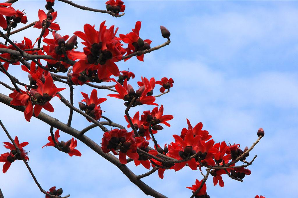 Cup-shaped red flowers with fivepetals appear in the spring before the new foliage. The kapok tree is characterized by its crimson blossom which makesthe tree seem to be caught in a fierce fire. The kapok tree is known as the “hero tree”due to the fact that when it is in blossom,it is like it has been soaked in the blood of heroes, revolutionary pioneers and patriots who fought so bravely for their beliefs,regardless of the danger that they would die for their dreams. Another reason for this nickname is that unlike other flowers, when kapok flowers fall off the tree and lie on the ground they don’t wither or fade in color, which means they die in a heroic way. When a breeze waftsthrough, petals wave and dance in elegance like countless elves of fire greeting and playing with each other delightedly. It produces a capsulewhich, when ripe, contains white fiberslike cotton. Seeds are numerous, long, ovoid, black in colorand packed in white cotton. The leaves are covered with about sixleaflets radiating from a central point. As for the fruit, which reaches an average of 13 centimeters in length, it is light-green in color in immature fruits, brown in mature fruits.