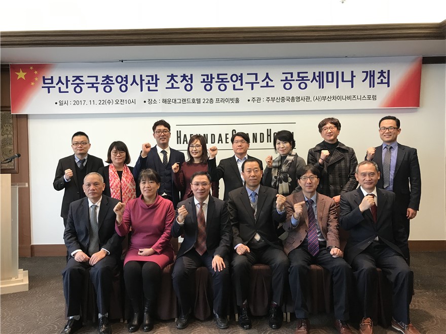 On the morning of November 22nd, the symposium between the Busan-China Business Forum and Guangdong Institute for International Strategies was held in Haeundae. LIU Haichun; scholars of the institute; AN Chengpei, President of the Busan-China Business Forum, and more than 20 members of the forum, attended the symposium. RAN Deyan, Counsellor of Chinese Consulate General, attended the symposium and delivered a speech. XIAO Yaofei and HAN Yonghui, the senior fellows at Guangdong Institute for International Strategies, gave a speech respectively on the topic of The Research on Sino-Korean Trade and Global Cooperation on Production Capacity and the Influence of Cultural Exchange on Global Trade: Based on China's research on the One Belt and Road countries' Confucius Institutes.