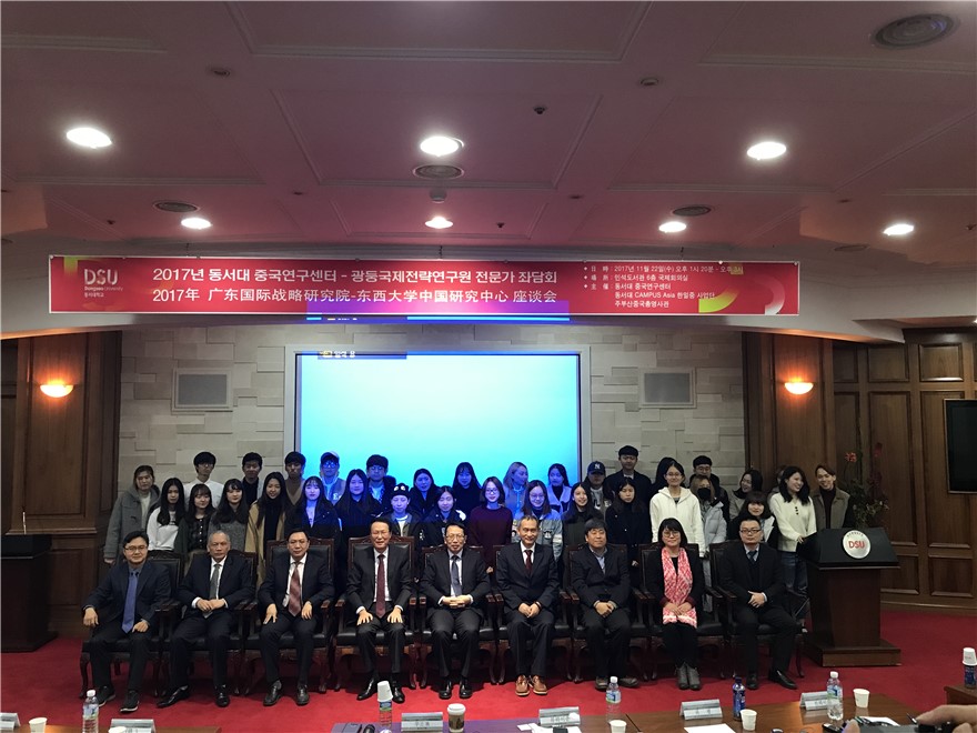 On the afternoon of November 22nd, LIU Haichun and the delegation took part in the symposium between Guangdong Institute for International Strategies and China Studies Center of Dongseo University. GUO Peng, the Chinese Consul General in Busan, and RAN Deyan, also attended the symposium. At the symposium, CHEN Weiguang, the senior fellow at Guangdong Institute for International Strategies, and JIN Mei, Director of the Korean Department, gave a speech respectively on the topic of Building the Belt and Road: Concept, Practice and Opportunities for Development and Under the Background of One Belt and Road, the Education and Development of Non-common Languages in China. They discussed the Sino-Korean business cooperation and the Belt and Road Initiative with the attendees. LIU Haichun visited the exchange students in Dongseo University from GDUFS. In the face-to-face communication, he knew about their study, experiences in studying abroad and future plans. He persuaded the exchange students to adapt to life in Korea and integrate into the Dongseo University.