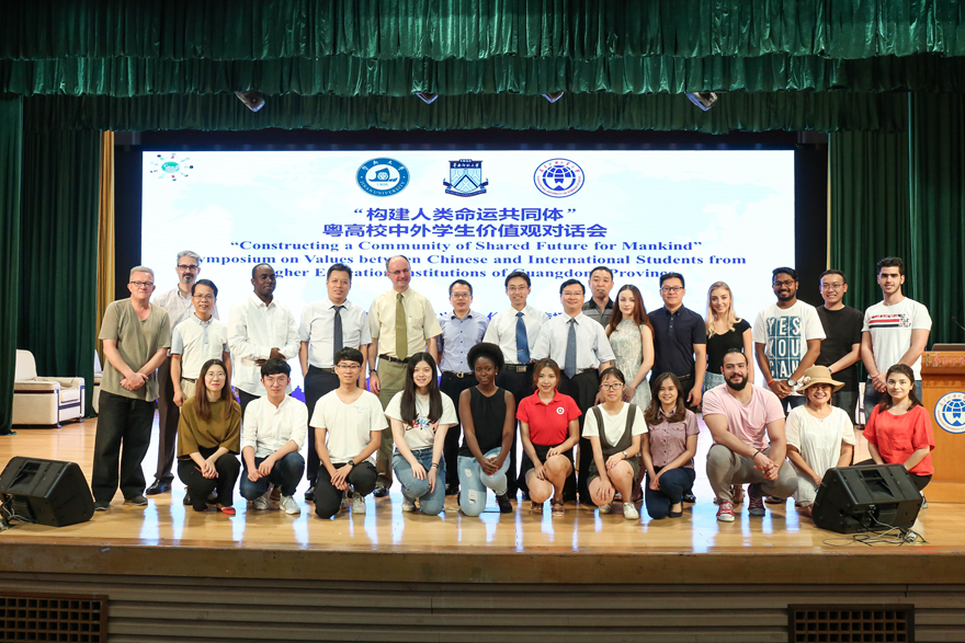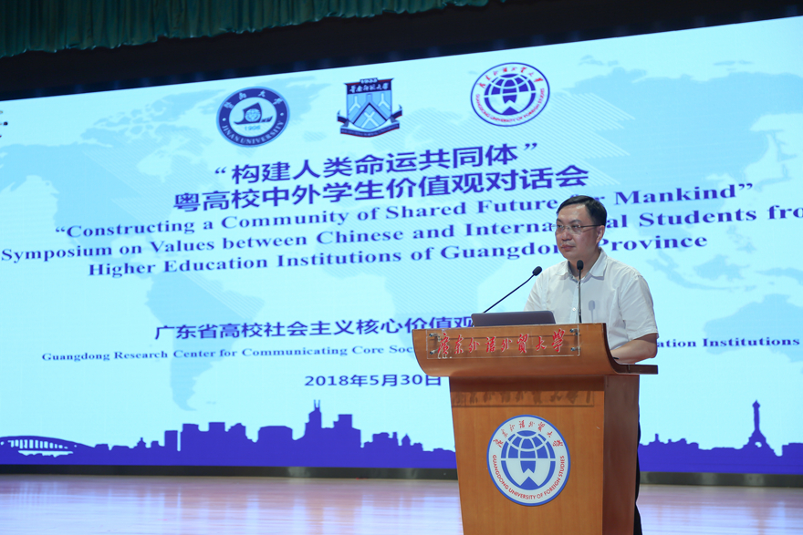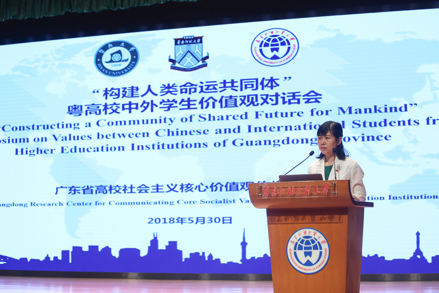 North Campus, Guangdong University of Foreign Studies, May 30th 2018: On May 30th, in the Lecture Hall of the 6th Teaching Building at GDUFS, the Symposium on Values between Chinese and International Students from Higher Education Institutions in Guangdong Province was held, focusing on constructing a community of shared future for mankind.