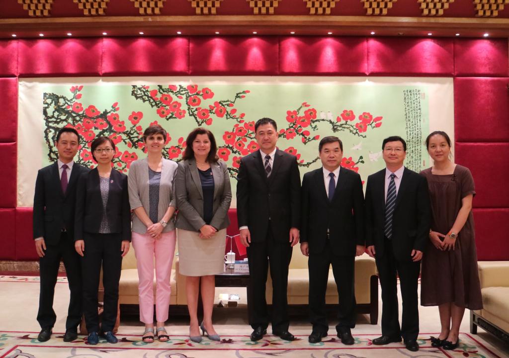 North Campus, Guangdong University of Foreign Studies, May 29th: On May 29th, Dana Prudíková, Deputy Minister of the Ministry of Education, Youth Work and Physical Education of Czech Republic; YOU Lena, Deputy Director of Czech Republic Embassy in China, and SONG Fang, Political Affairs Assistant of Czech Republic Embassy in China, visited GDUFS. SUI Guangjun, Party Secretary and President of GDUFS, and JIAO Fangtai, Vice President of GDUFS, received the guests in the VIP Hall of the Administration Building. The two sides talked about the development of GDUFS and communications with Czech universities.