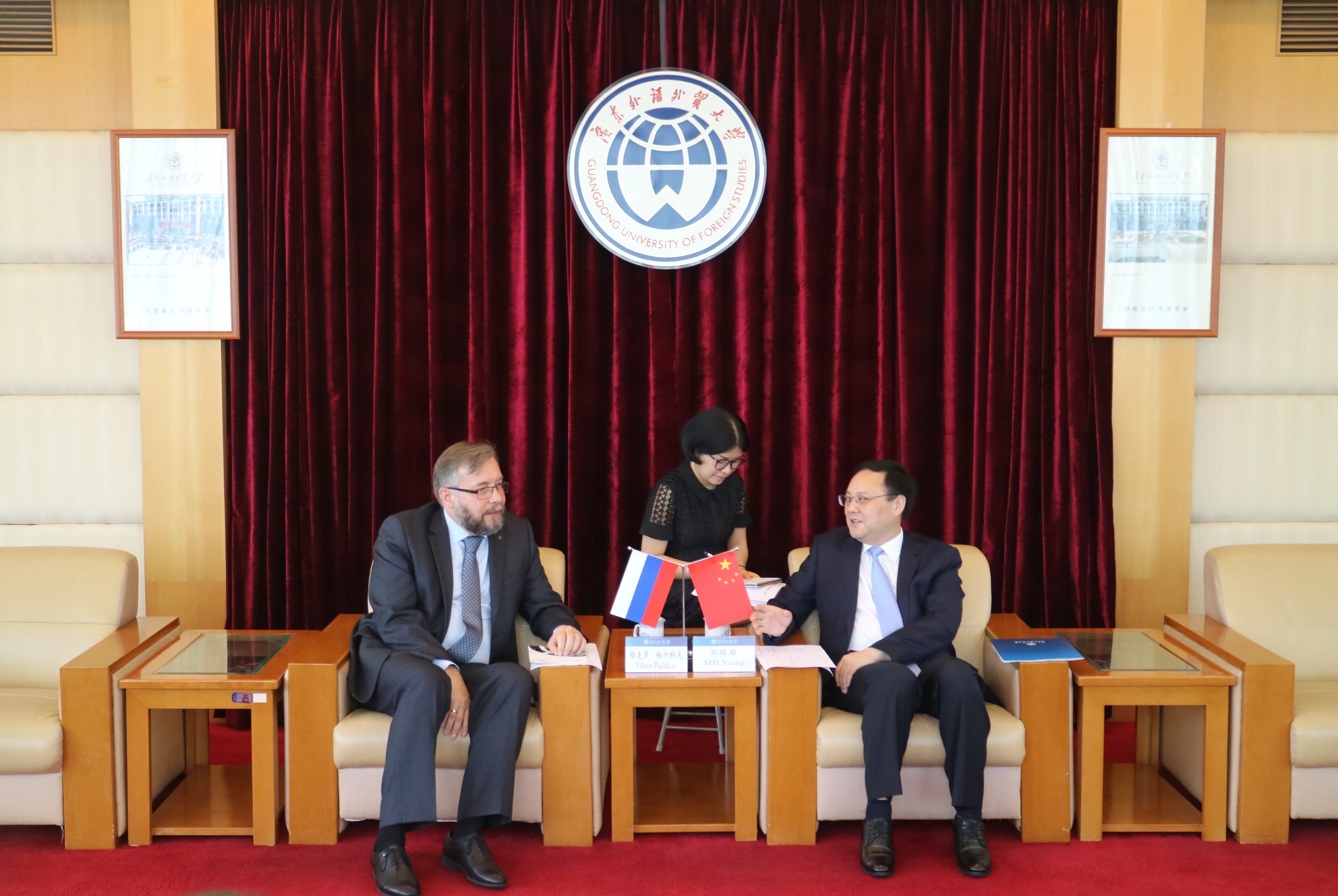 Viktor Pashkov thanked SHI Youqi for his warm welcome, and mentioned that the collaboration between GDUFS and Russian universities and colleges has been fruitful for a long time. He hoped that this visit can facilitate more cooperation and exchange between GDUFS and Russian universities and colleges, promoting the development in the field of education in China and Russia. In addition, he also expressed his willingness to support and assist the improvements of Russian major as well as Russian Centre in GDUFS.