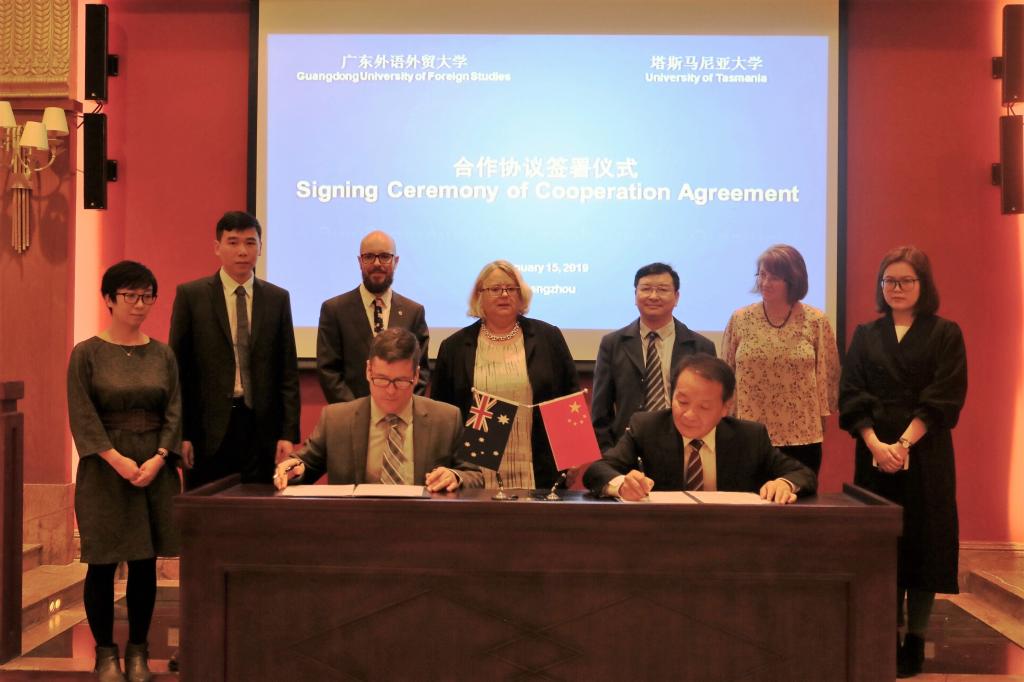 North Campus, Guangdong University of Foreign Studies, January16th 2019: On January 15, Robert Atkinson, the Vice President of the University of Tasmania, Australia, and his delegation visited GDUFS. CHEN Linhan, the Vice President of GDUFS, met the guests in the VIP Room of the North Campus Lounge. Both sides discussed the issues about the cooperation between GDUFS and University of Tasmania and signed a cooperation framework agreement.