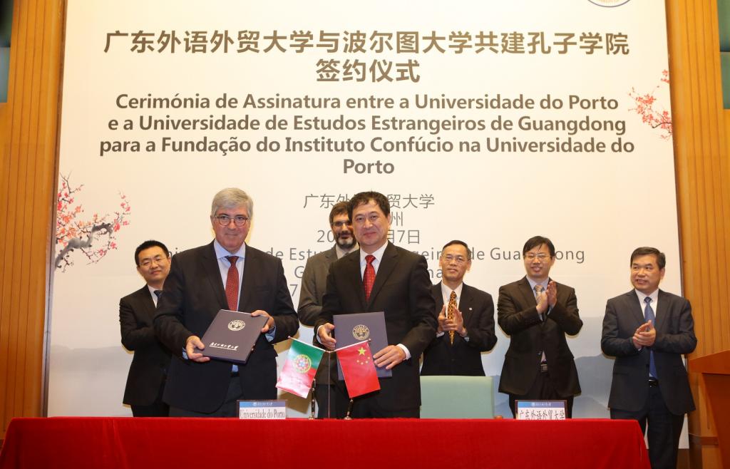 Attendees for the signing ceremony and seminar of exchange were: António de Sousa Pereira, President of the University of Porto; João Veloso, Vice President and Principal of Confucius Institutes; SUI Guangjun, Chairman of the University Board; OUYANG Jiangxuan, Vice Counsel of the Foreign Affairs Office of the People’s Government of Guangdong Province; ZHOU Guoping, Vice Director of the Exchange and Cooperation Division of the Department of Education of Guangdong Province; YIN Dongmin, Project Officer of the Division of Development and Planning Confucius Institute Headquarters/ Hanba; WEI Jing, Project Officer of the Division of European Confucius Institutes; and principals of other faculties of GDUFS. The signing ceremony was host by JIAO Fangtai, Vice President of GDUFS.