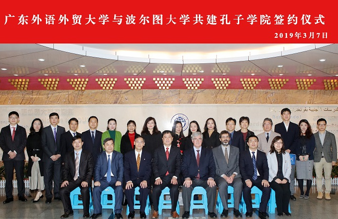 North Campus, Guangdong University of Foreign Studies, March 7th 2019: The signing ceremony of co-constructing Confucius Institutes between GDUFS, the University of Porto, and the seminar of Sino-Portuguese cultural exchange was held in the International Meeting Hall of the North Campus. Hanban; the Foreign Affairs Office of the People's Government of Guangdong Province; the Department of Education of Guangdong Province; and principals, as well as teachers and students of the two universities, attended the meeting.