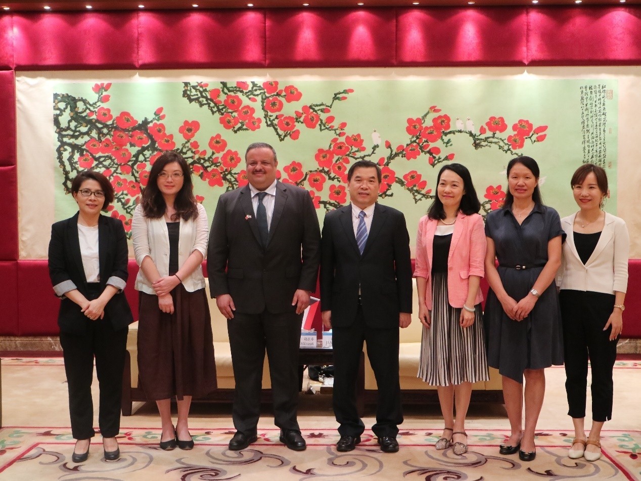 On June 25th, Khalifa Alkhorafi, Consul General of Kuwait Consulate General in Guangzhou, visited GDUFS. JIAO Fangtai, Vice President of GDUFS, met with the guests in the VIP room of the administration building.
