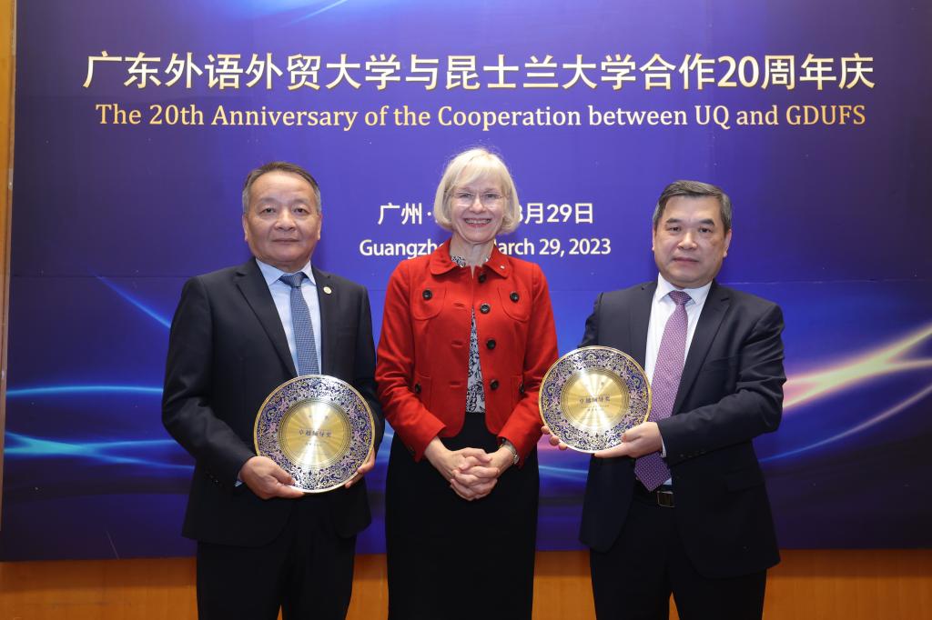 Baiyun Mountain Campus, Guangdong University of Foreign Studies, March 29, 2023: On March 29, the 20th anniversary celebration of cooperation between GDUFS and the University of Queensland was held in the International Conference Hall of the Baiyun Mountain Campus. Shi Youqi, party secretary and president of our University, Deborah Terry AO, president of the University of Queensland, Australia, Consul General of the Australian Consulate General in Guangzhou Deng Anyi and researcher Zhou Liuyu of the Exchange and Cooperation Office of the Education Department of Guangdong Province attended the ceremony to celebrate cooperation for 20 years. They reviewed the past achievements and looked forward to future cooperation. The celebration was hosted by vice president Jiao Fangtai.