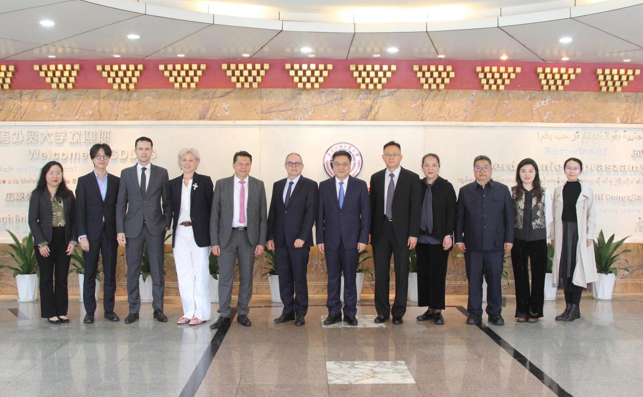 On the afternoon of March 13th, Consul General Sylvain Fourriere and his delegation from the Consulate General of the Republic of France in Guangzhou visited our university. They were accompanied by the President’s team from the ESC Clermont Business School. Shi Youqi, Secretary of the Party Committee of GDUFS, received the guests in the VIP Lounge of the Administration Building on Baiyunshan Campus. They exchanged views on talent cultivation, discipline construction, and the promotion of cultural exchanges.