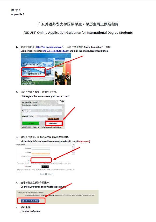 Online application. Applicants please submit online application through http://gdufs.17gz.org/ and please get confirmation via phone call (0086-20-36207141) or email (studyiniie@gdufs.edu.cn) to the Admission Office, Institute for International Education (Admission Office, IIE).