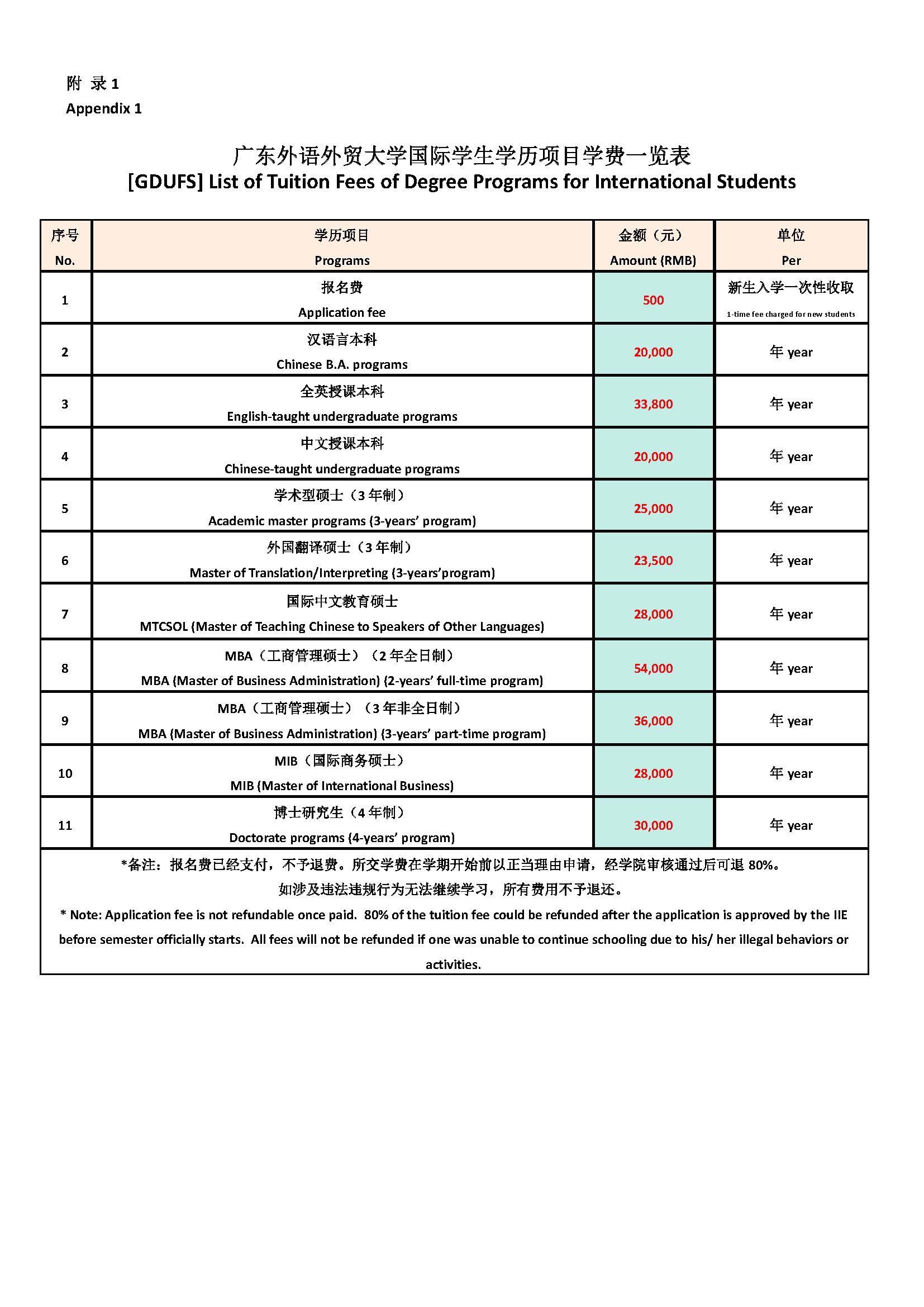 Appendix 1 [GDUFS] List of Tuition Fees of Degree Programs for International Students