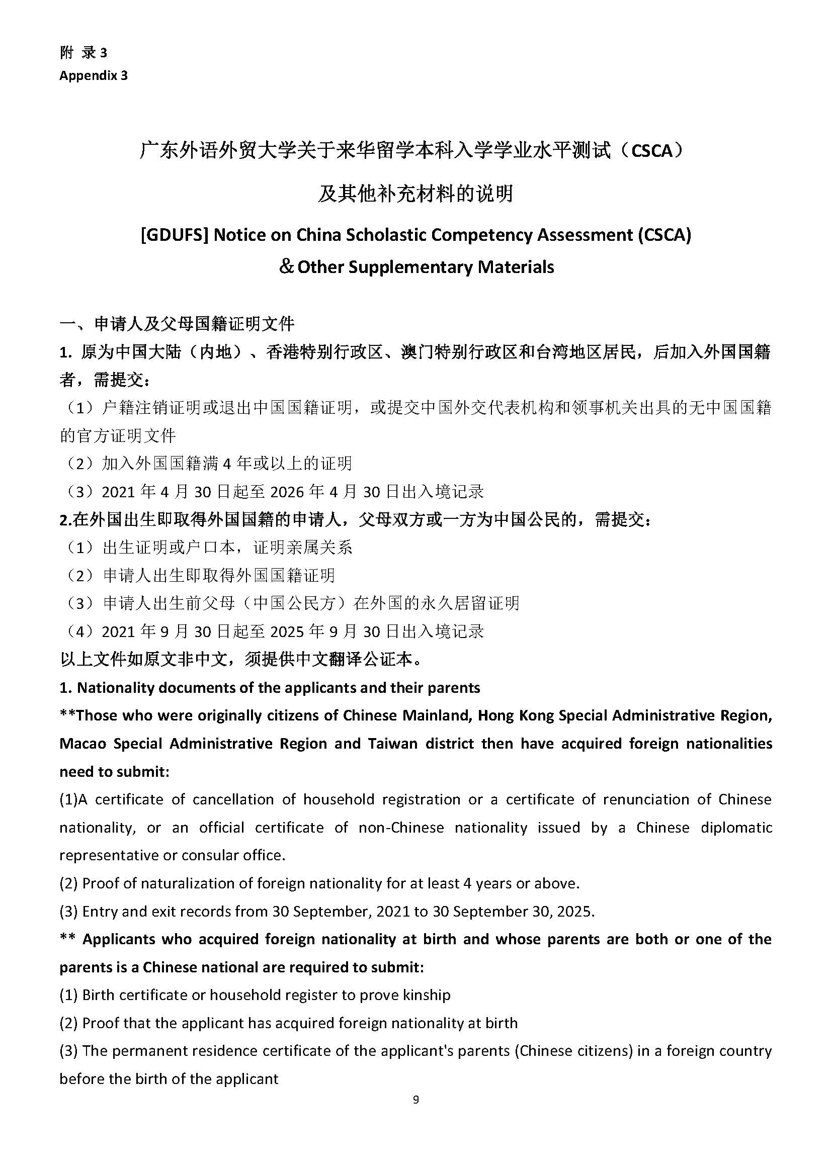 Appendix 3. [GDUFS] Notice on China Scholastic Competency Assessment (CSCA) &Other Supplementary Materials
